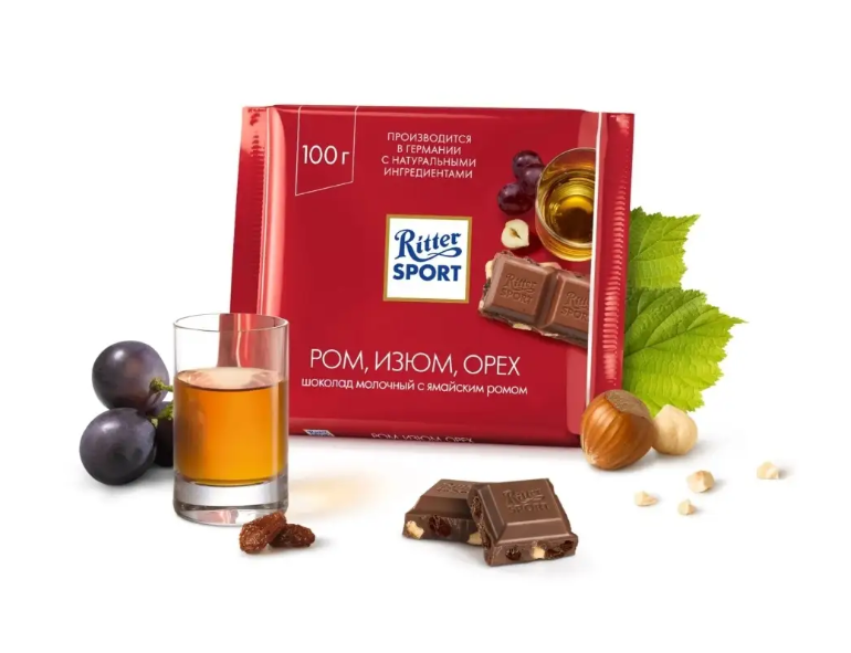Риттер Спорт Молочный шоколад Ром Изюм Орех